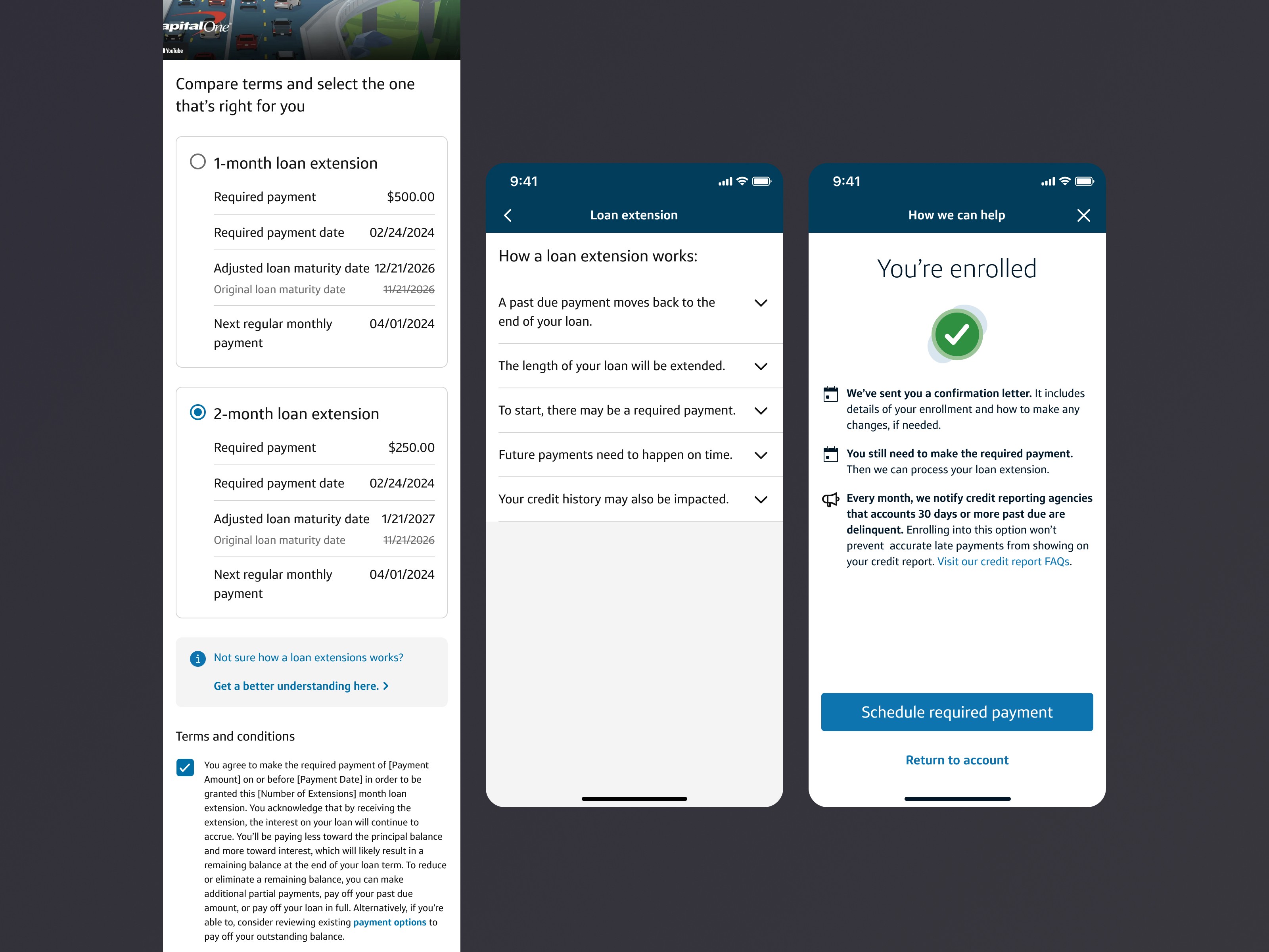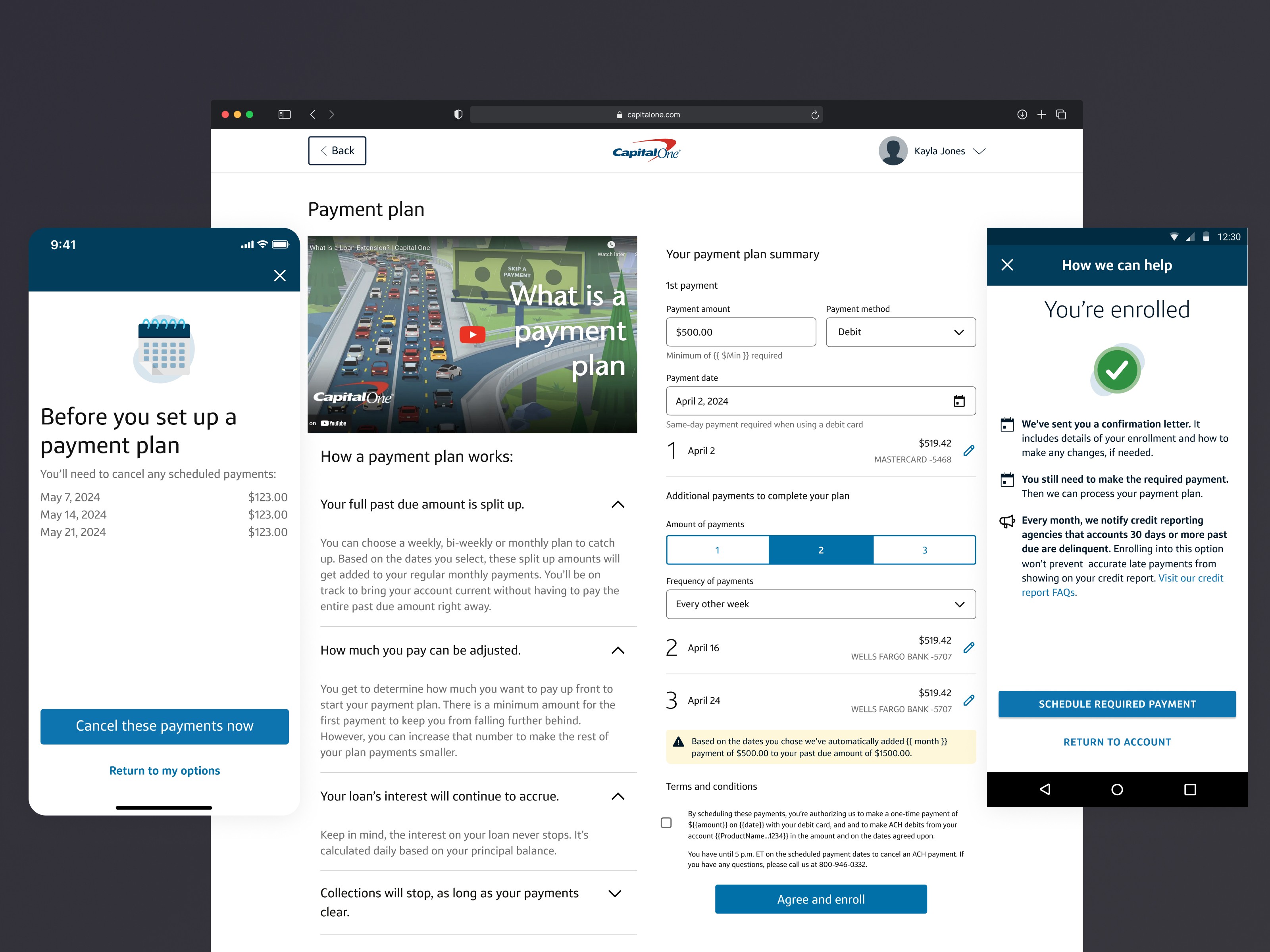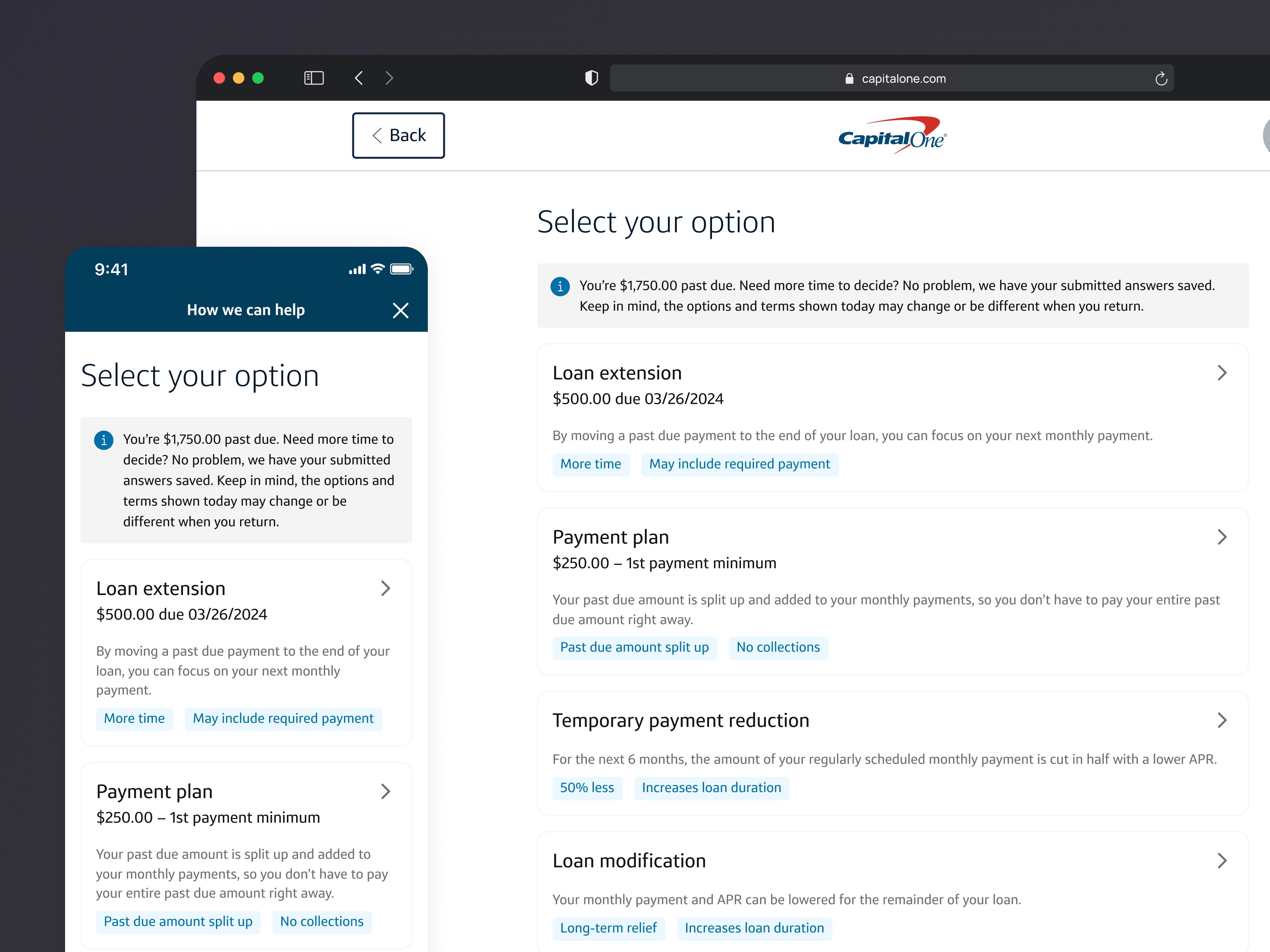 The Presentment project was part of the Help Me Catch Up experience in Capital One’s Auto finance financial servicing team. This flow supported users struggling with auto loans by offering solutions like payment plans, loan modifications, and temporary payment reductions, transitioning from an agent-driven channel to a user-friendly digital experience.